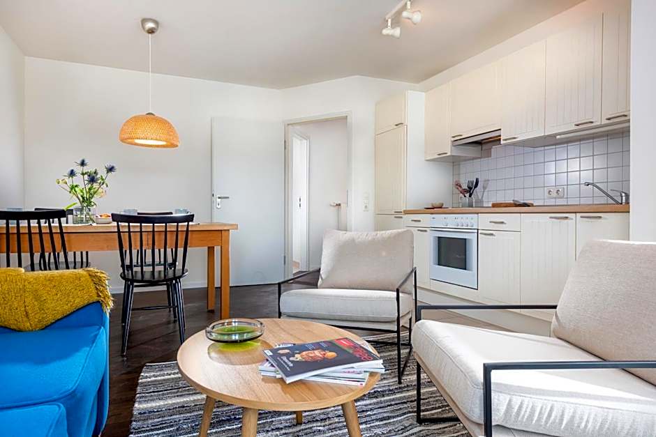 This apartment features a balcony, a living room with additional sleeping facilities and a kitchenette with dining area. The bathroom is fitted with a shower.